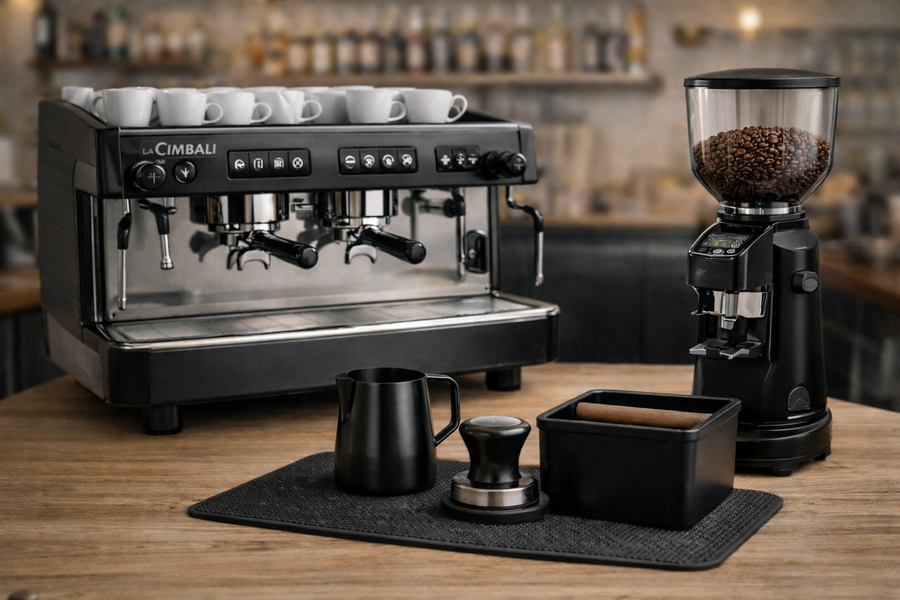 عرض تجهيز كافيه متكامل يشمل ماكينة إسبريسو كاسديو، مطحنة قهوة احترافية، أدوات تحضير أساسية